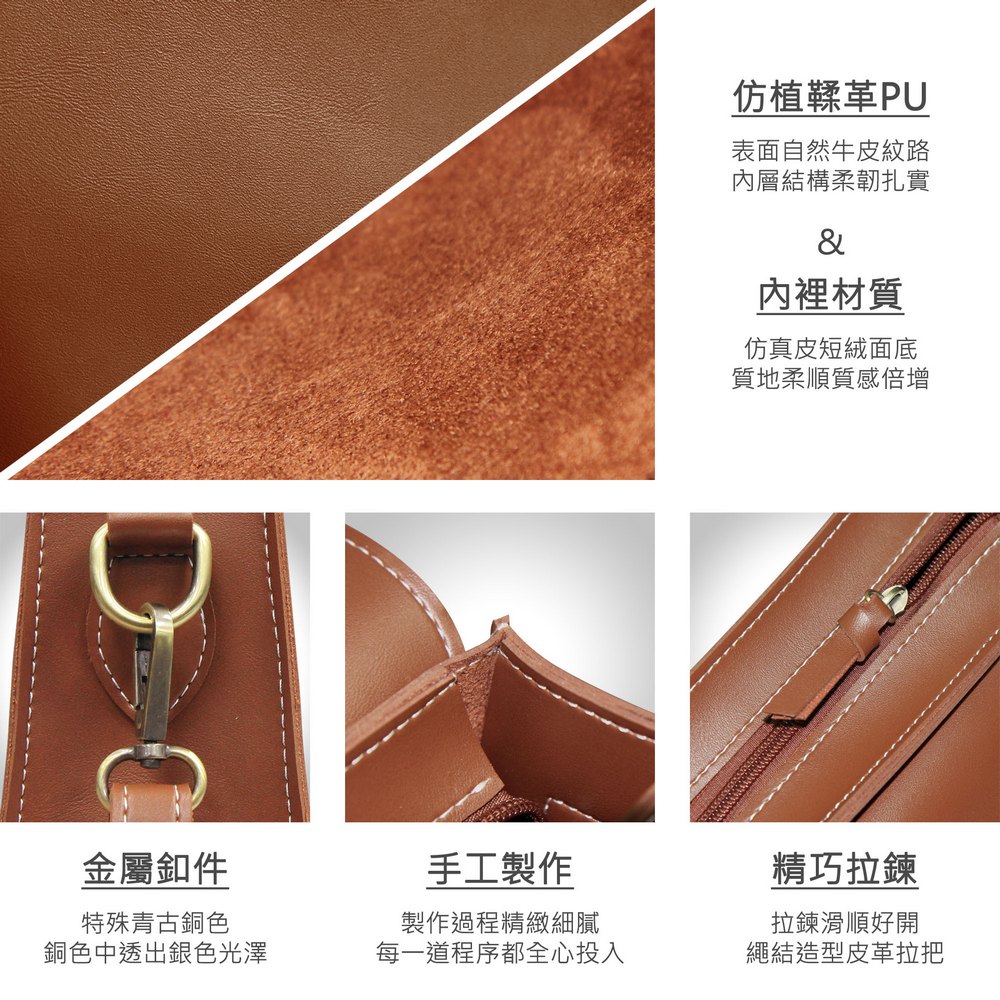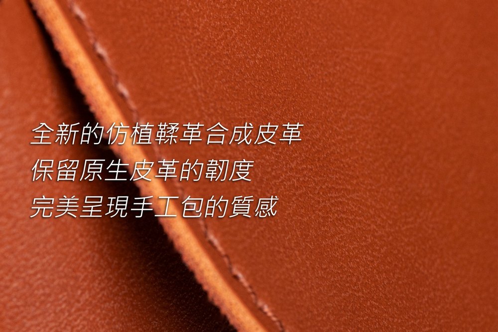 仿植鞣革PU是在近幾年才研發出來的人造皮革,除了靠增加厚度去達到近似植鞣革的效果之外,也在皮革的背面改造成高壓貼合的植絨表面,更增加了整體密度,去達到原生皮革的質感。所以我們很成功地可以採用人造皮革來製做出高質感的手工包款,不僅為喜愛手工產品的人降低了購買包包的負擔,也期望減少一般人對動物皮革的需求。