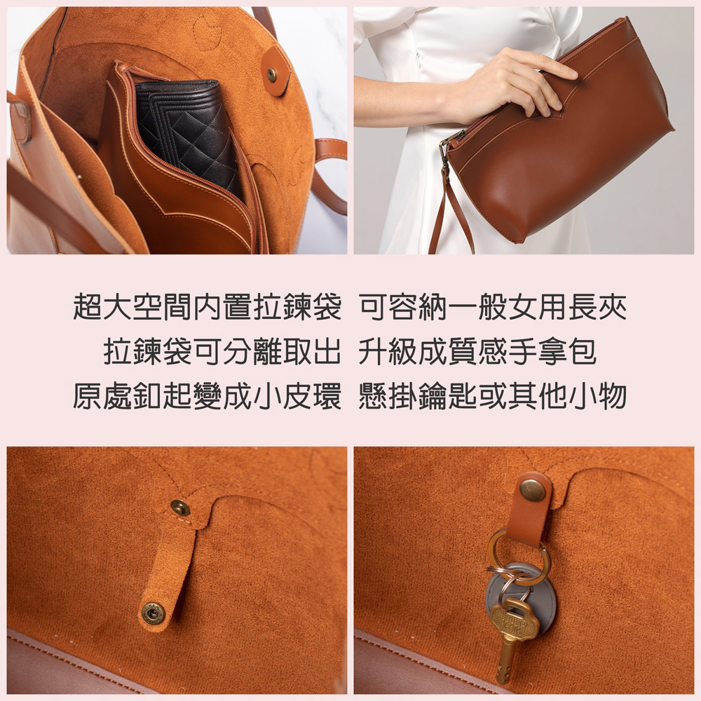 內置拉鍊袋可以分離出托特包,當成一個單獨的質感手拿包!(附贈皮質手腕帶)